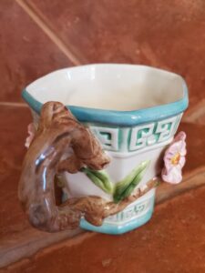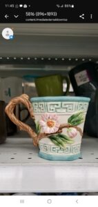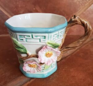 I found this beautiful Fitz and Floyd mug today, and it immediately caught my eye. The sculpted cherry blossoms, the soft aqua rim, and the twisted branch handle make it feel more like a small piece of art than an everyday mug. It has that hand-crafted charm Fitz and Floyd is known for—decorative, a little whimsical, and full of detail.