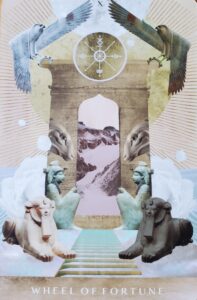 At the center of the card stands a gate, crowned by the Wheel of Fortune itself.